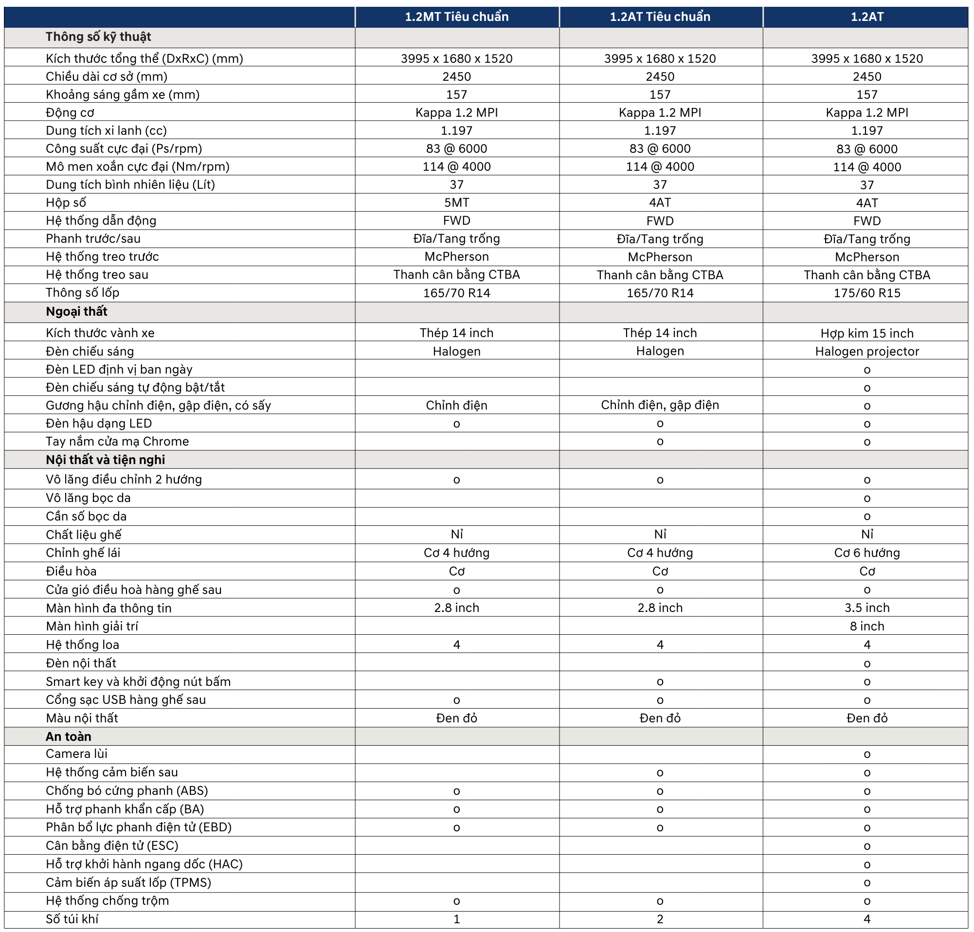 Thông số kỹ thuật Hyundai i10 Sedan 1.2MT Tiêu Chuẩn